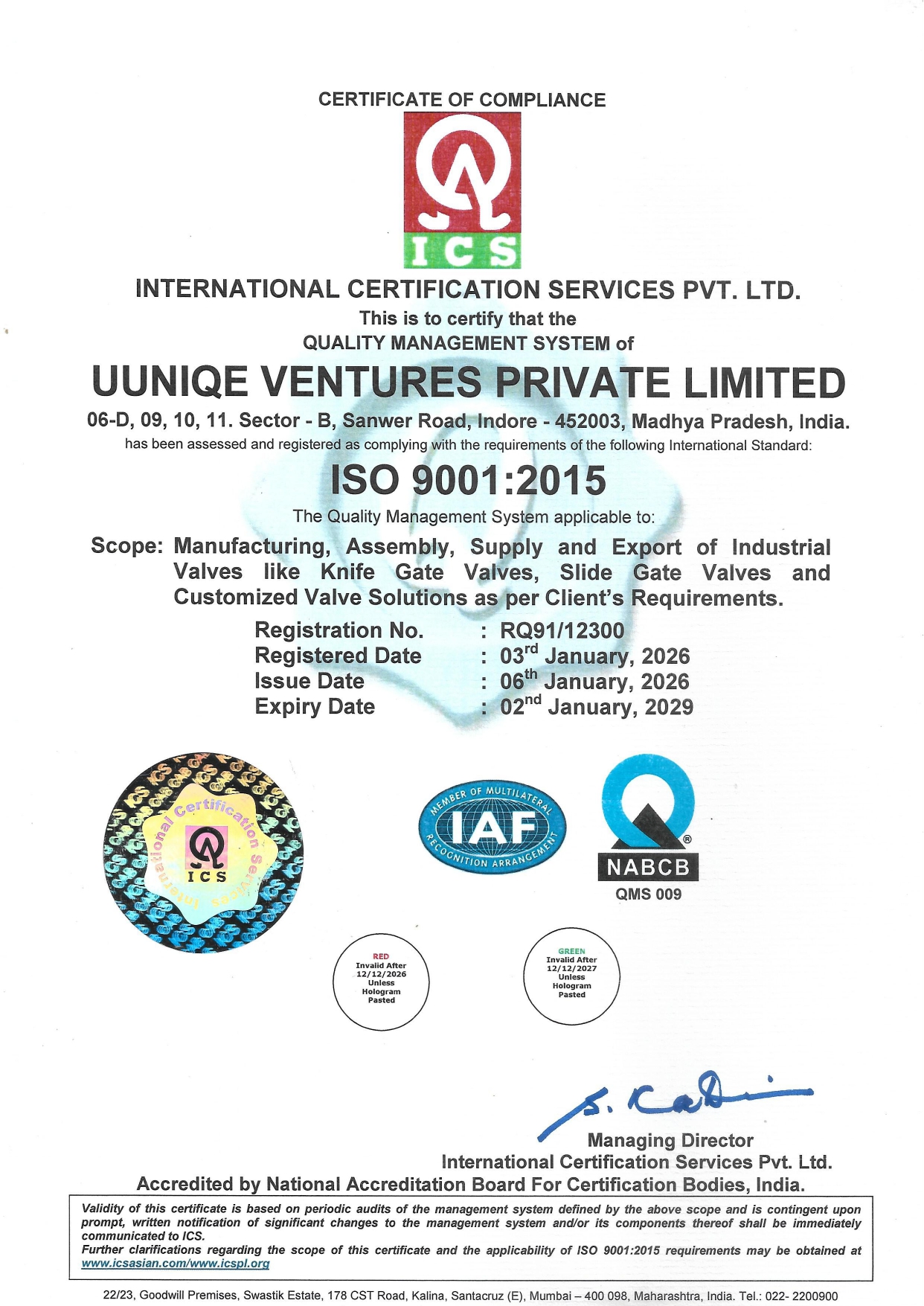 Our manufacturing operations are governed by an ISO 9001:2015 certified Quality Management System and reinforced by ZED Silver Certification, reflecting our commitment to Zero Defect production and Zero Effect environmental practices. All processes—from raw material inspection, machining, assembly, and testing to packing and dispatch—are executed under documented procedures, defined quality controls, and continuous improvement mechanisms. The ZED framework further ensures process efficiency, waste reduction, workplace safety, and sustainable manufacturing practices. Together, these certifications validate our capability to deliver consistent, reliable, and internationally compliant industrial valve solutions for domestic and export markets.